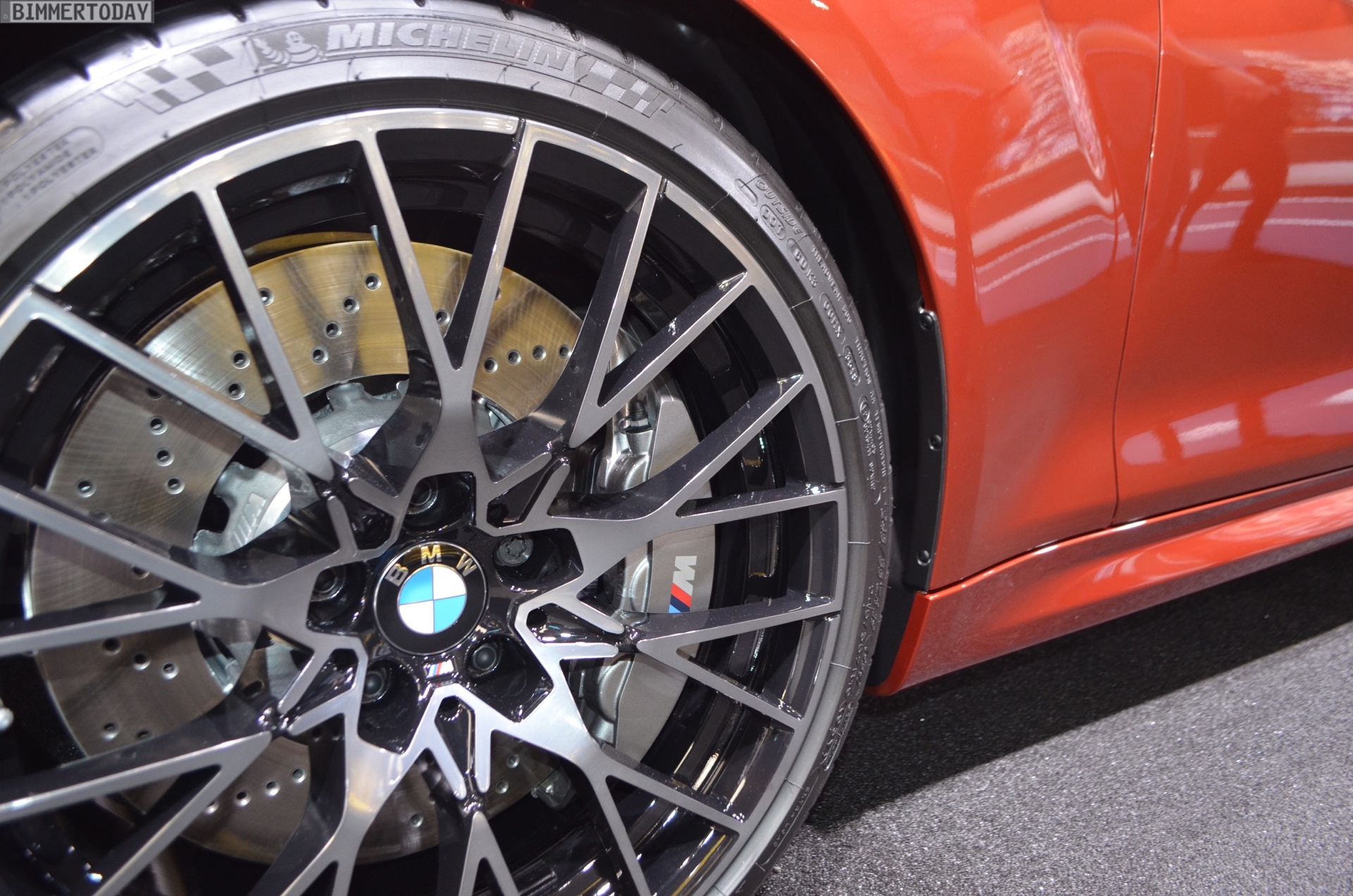 Der gezeigte F87 kombiniert Sunset Orange mit den optionalen 19-Zoll-Leichtmetallrädern Y-Speiche 788 M in Schwarz, die zu einem Aufpreis von 850 Euro erhältlich sind. Gemeinsam mit ohnehin schwarzen Design-Details wie den exklusiven Nieren des BMW M2 Competition ergibt sich ein stimmiges Bild, bei dem komplett auf glänzende Elemente in Silber oder Chrom verzichtet wird.