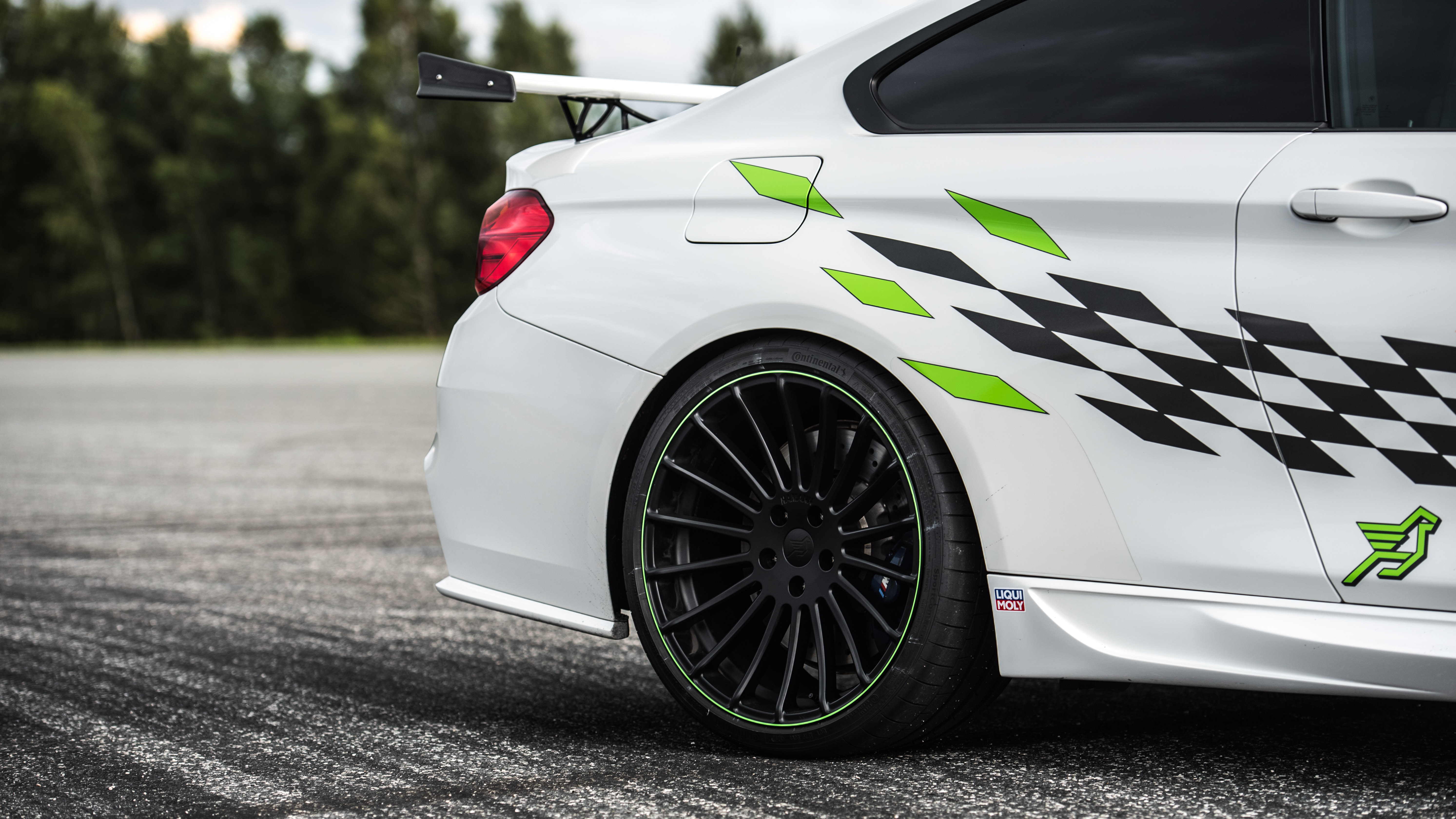Um das M4 Coupé auch richtig in den Wind zu drücken, haben die Tuningspezialisten ein aufwendiges Aerodynamik-Paket geschnürt: vorne gibt es eine markante Carbon-Spoilerlippe und auf das Heck hat man einen GT-Heckflügel mit Carbon-Seitenflaps aufgeschraubt. Der 7-teilige Heckabschluss mit Finnen in Sicht-Carbon umrahmt unter anderem den Diffusor mit vier Carbon-Winglets sowie dem 4-Rohr-Sportendschalldämpfer.
